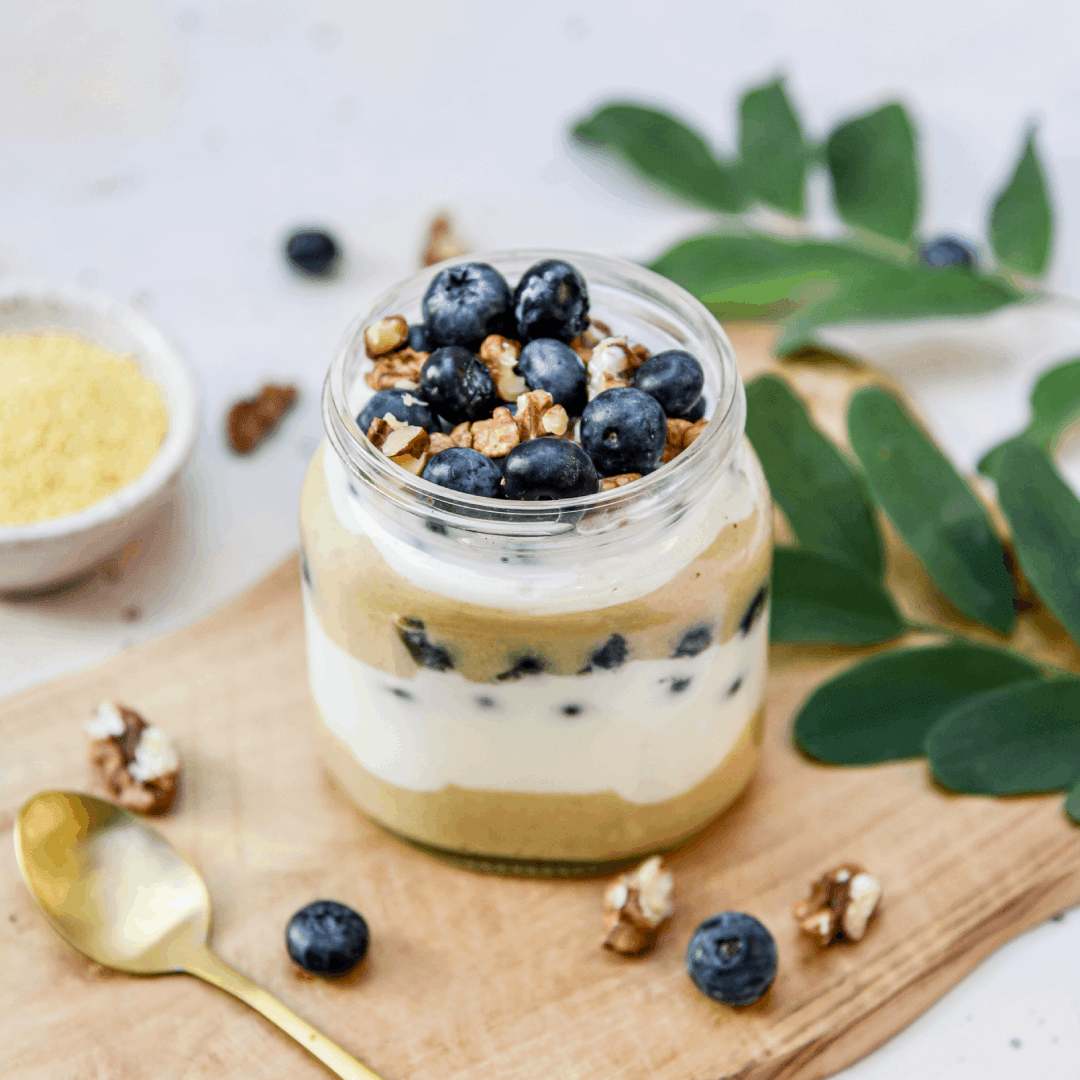 3. Przełożyć do słoiczka warstwami – skyr, borówki, posiekane orzechy i masę z kaszy jaglanej. Całość schłodzić w lodówce przynajmniej przez 10 minut.